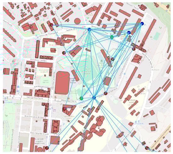 The first step resides in the translation of each building into an individual graph structure, with edges forged in accordance with and in proportion to the spatial relationships embedded in the dataset features. Other researchers have also brought into attention the efficacy of graph-based representations in capturing complex dependencies and patterns within spatial data. The work of Kipf and Welling [] emphasizes the utility of Graph Neural Networks (GNNs) in modeling relationships in non-Euclidean domains, precisely the particular complexities associated with urban spatial datasets. The construction of graphs, with buildings as nodes and edges denoting spatial distances, aligns with the principles of graph theory, providing a more comprehensive representation of the urban environment.