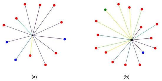 Representative visualization samples from each category, where the difference in distance, plurality of representative neighboring features, and area are evident. (a) Graph-based visualization of a parking building (positive classification sample); (b) graph-based visualization of a false parking building (negative classification sample). In both samples the central black circle is representative of the site under classification, while the other circles follow the same color scheme adopted in Figure 1. The color of the edges is determined by their weight according to a standard colormap.