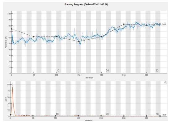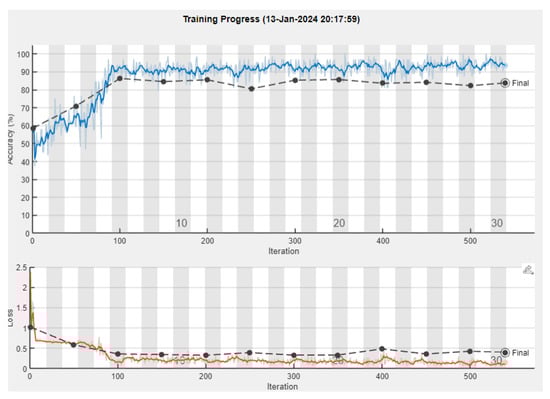 VGG-16, on the other hand, epitomizes a middle ground between the architectural profundity of AlexNet and the computational efficiency of SqueezeNet. VGG-16 features a homogeneous architecture comprising stacked convolutional layers with small 3 × 3 filters, interspersed with max-pooling layers for spatial downsampling []. This uniformity and depth contribute to facilitating the learning of rich hierarchical representations, which in turn leads to enhanced generalization performance across an extended range of datasets. Despite its computational demands, VGG-16 remains a cornerstone in the CNN field, offering a versatile platform for deep feature learning.