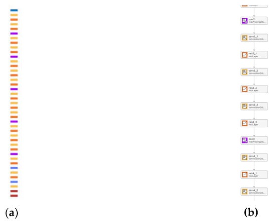 Depiction of the layers and architecture of the VGG-16 CNN used for classification. (a) Architecture of the CNN containing all of the layers; (b) magnified fragment demonstrating a partial view of the network layers and connections. The color scheme used is identical to the one detailed for SqueezeNet in Figure 6.