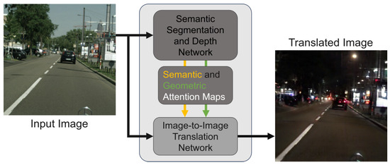 The proposed method aimed to enhance the semantic and geometric information for the day-to-night image translation network. As a means of enhancing the semantic and geometric information, we introduced attention maps derived from relevant information in the input images, which were then utilized in the image translation network.