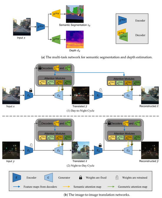 Figure 2a provides an overview of the multi-task network for the estimation of semantic segmentation and depth. The multi-task network first encodes authentic daytime images into latent representations via the encoder ; then, the decoders and estimate semantic segmentation maps and depth maps , respectively, from the latent representation: (1) semantic segmentation map and (2) depth map .