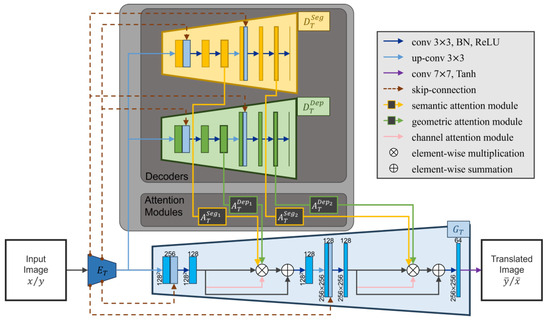 In this section, we propose a semantic- and geometric-aware day-to-night image translation method based on the CycleGAN framework [22]. When translating daytime images to nighttime ones, both descriptions of light sources with semantic properties and expressions of darkness according to geometric distances are required. As shown in Figure 2, the proposed method aims to extract semantic and geometric information from input images and apply it to the image-to-image translation network with the attention mechanism.
