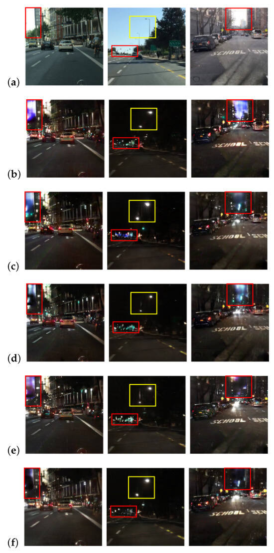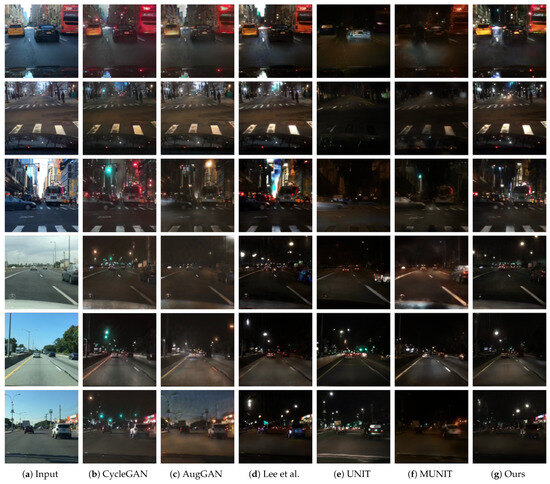 Figure 4 shows the day-to-night image translation results of each method. CycleGAN [22], Lee et al.’s method [64], UNIT [27], and the proposed method generate expressions of streetlights, while other methods do not generate these expressions. Furthermore, our method generates visually more detailed expressions (i.e., color, shape, and position) of the streetlights than CycleGAN [22], Lee et al.’s method [64] and UNIT [27]. Translation failures in the sky area, sandwiched between buildings, are observed from the results of CycleGAN [22], AugGAN [43,44], and Lee et al.’s method [64]. UNIT [27] and MUNIT [30] appear to fail in their translations, as they darken the entire scene, giving the impression of inverting the colors in the images. In contrast, the proposed model’s results demonstrate the preservation of color information for each object in the input image. The results of our method show the car and road in front of the ego vehicle being illuminated by headlights.