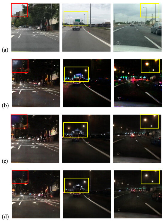 In this context, our proposed model received the highest evaluations in both the quantitative and qualitative assessments of realism. Simultaneously, it recorded values close to the Diversity (LPIPS [68]) of real night images. Hence, our proposed model can be deemed to have performed the best overall.
