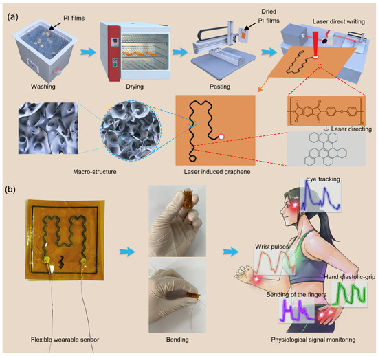 - Zou, Y.; Zhong, M.; Li, S.; Qing, Z.; Xing, X.; Gong, G.; Yan, R.; Qin, W.; Shen, J.; Zhang, H. Flexible wearable strain sensors based on laser-induced graphene for monitoring human physiological signals. Polymers 2023, 15, 3553. [Google Scholar] [CrossRef] [PubMed]