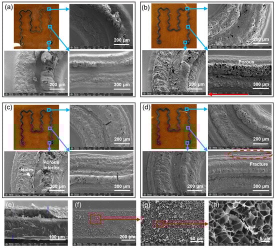 Influence of the scanning account on the microscope of the LIG at corners, curves, and circles, respectively. (a) Scanning conducted one time. (b) Scanning conducted two times. (c) Scanning conducted three times. (d) Scanning conducted four times. (e) Cross–sectional SEM image of LIG with three scans. (f–h) SEM images of the PI surface after the detachment of LIG with three scans at different scales.