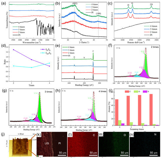 The LIG powder data provided more accurate characterization results. However, one laser scan could not produce LIG and collect the powder, so we characterized the LIG powder and carbon precursor PI with two to four laser scans. The spectral detection results of the LIG and PI with two to four laser scans are shown in Figure 3. As shown in Figure 3a, the PI and LIG functional groups are easily detected by FTIR spectroscopy. Evidently, the absorption peak diminished during the conversion of PI to LIG. Within the wavenumber range of 500–1800 cm−1, there was a noticeable decrease in the intensity of the stretching vibration peaks of the C–N bond, C=O bond, and aromatic ring. In addition, within the wavenumber range of 2800–3000 cm−1, there was attenuation in the peak intensity of the C–H bond’s stretching vibration. Figure 3b shows the XRD patterns of the LIG and PI obtained using different laser scanning times with utmost precision. Compared with the pattern of PI, that of the LIG exhibited distinct (002) and (100) peaks [33]. The presence of these peaks reflects unique characteristics that are specific to the layer arrangement pattern of graphene materials, which appear at smaller (2θ = 25.18°) and larger angles (2θ = 43.6°). Figure 3c shows the Raman spectra of the PI and LIG. The LIG exhibited three distinct peaks that were not observed for PI, and the positions of the LIG peaks remained consistent across different laser scanning times. In particular, the D peak was observed at 1343.2 cm−1, the G peak at 1580.1 cm−1, and the 2D peak at 2700.1 cm−1 [35]. These findings provide evidence for the graphene composition of LIG. The intensity of the D peak reflects defects in the LIG, with higher intensities indicating larger defects. Meanwhile, the G peak corresponds to the lattice vibration of the LIG, with stronger intensities indicating enhanced graphene lattice integrity. Further, the 2D peak represents vibrations between two carbon atoms, and large values suggest fewer LIG layers and a higher overall material performance. Variations were observed in the D, G, and 2D peak intensities for different scanning times. Accordingly, the spectra shown in Figure 3c were analyzed. A lower ID/IG ratio corresponds to a reduced number of defects, a higher I2D/IG ratio, and fewer LIG layers. The calculation of the PI as the carbon precursor was not performed. Figure 3d shows that as the scanning times increased, the ID/IG values were 1.29, 0.89, and 0.62, and the I2D/IG values were 0.63, 0.57, and 0.75. Raman detection revealed that there were the least LIG defects for four scanning times. Meanwhile, the LIG defects for two scanning times were comparatively more prevalent.