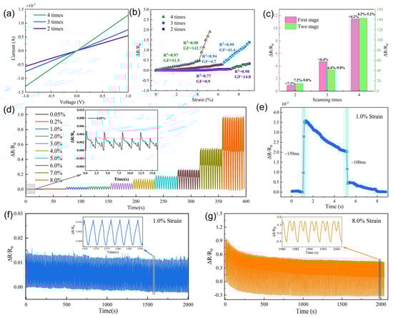 Hence, we are currently investigating flexible sensors fabricated using two to four scans. Figure 4a shows the current–voltage test results of these flexible sensors, revealing their outstanding resistance stability. Figure 4b shows the test results of the relative resistance changes observed in the three flexible sensors. Sensors fabricated using varying scanning times exhibited distinct characteristics during the stretch–release test. Using a two-stage formula, we successfully achieved linear fitting to establish a relationship between the tensile strain and relative resistance change. Notably, an expression exists for sensitivity (GF) in this relationship, which encompasses relative resistance change and tensile strain change.