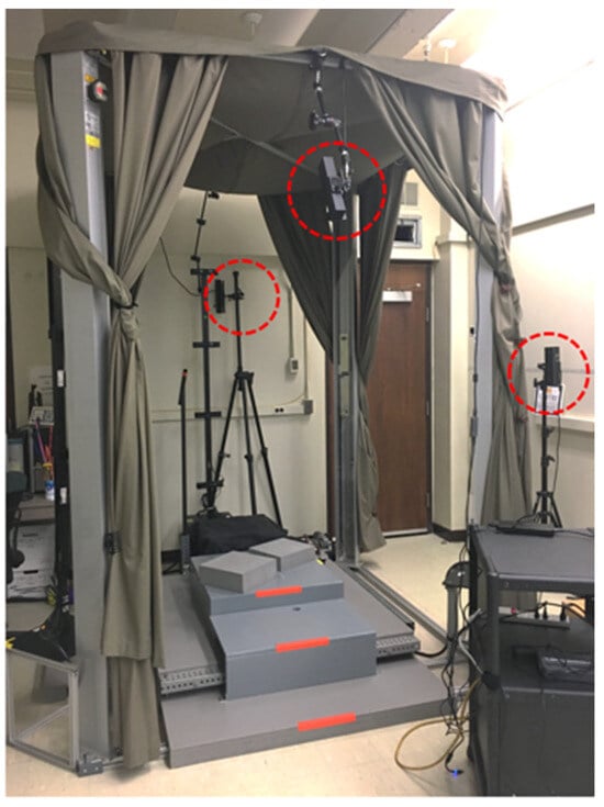 The system hardware system consists of three Microsoft Kinect V2 sensors aimed at the front, back, and side of the participant. The high bandwidth of the sensor necessitates a dedicated computer for each sensor. Figure 1 shows the sensors positioned for the current study. The Kinect sensors were installed on the structure of a whole-body laser scanner (VITUS XXL) to enable near-simultaneous imaging of the participant by both systems. Kinect sensors placed on the front and rear sides are used for overall geometry capture, and sensors placed on the side are used for alignment of the captured geometry data.