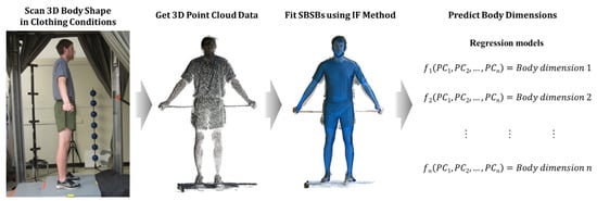 Recently, studies on fitting virtual avatars, such as statistical human models, to clothed body scans have attempted to capture body shapes under clothing (Guan et al., 2010 []; Hasler et al., 2009 []; Hu et al., 2021 []; Pishchulin et al., 2017 []; Yang et al., 2016 []; Lu et al., 2021 []). Bălan and Black (2008) [] presented a model-based body shape estimate system that finds a maximal silhouette-consistent shape to estimate body shape from a number of 2D images. Hasler et al. (2009) [] developed a technique using a statistical body shape model and an iterative closest point (ICP)-based Laplacian mesh deformation approach to predict the body shape of dressed humans. Guan et al. (2010) [] presented a method focusing on two-dimensional models for modeling clothing deformations on the body. Zhang et al. (2017) [] estimated the inner body shape in various postures while recovering surface details. These studies commonly require high computational resources to solve expensive optimization problems in order to estimate body shapes. Also, they focused on estimating visually realistic 3D body shapes rather than measuring body dimensions; thus, the results were not validated against actual dimension measurements. Hu et al. (2021) [] proposed a method that applied machine learning to predict undressed body shapes from dressed human scans by generating a dataset of synthetically combined dressed human and undressed ground truth body shapes.