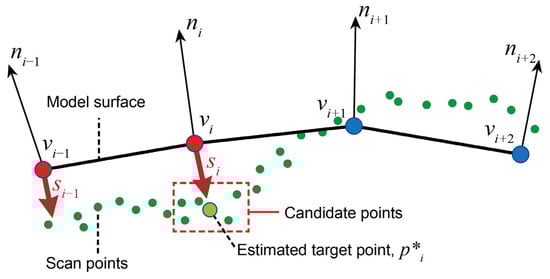 In the current study, the IF method was enhanced to deal with noisy point cloud data (PCD) obtained from consumer-grade depth cameras (Figure 3). First, the strategy of the previous IF method to determine the outside vertices was modified due to the absence of the surface normal information in the target PCD. Second, to address noise in the data, we improved the method to find inscribing vectors that move outside vertices to the target surface. Figure 3 shows the improved method to find the inscribing vectors when the target scan is PCD. Let vi be the ith vertex of the body shape model and ni be the normal vector of vi. To find an inscribing direction for vi. we first find the closest point pi among the target points. Since it is possible that pi is affected by noise and not on the actual target surface, we use an average of ten candidate points that are close to pi as a modified target point, p*i. We determine whether the vertex vi is outside the target surface (red vertices in Figure 4) by computing the inner product between ni and si, a vector from vi to p*i. The s vectors that have inner product values less than zero are chosen as the inscribing vectors.