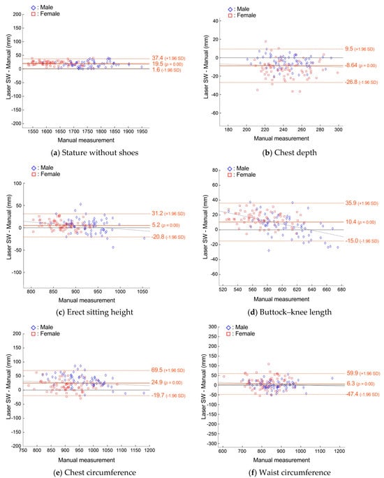 Bland−Altman plots of agreement between manual measurements and predictions from the system on Kinect scan data with scan wear (SW) clothing for anthropometric dimensions with linear regression lines and LoA.