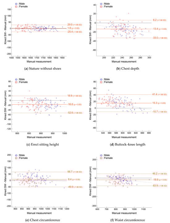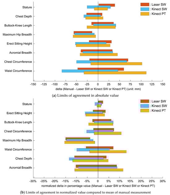 B–A plots in Figure 7 compare the manual measurements and predictions from the Kinect scans in SW. Stature and erect sitting height showed the smallest LoA ranges, at ±27.2 mm (1.6%) and ±35.8 mm (4.0%), while chest depth and waist circumference had the largest percentage LoA, at ±19.6 mm (8.0%) and ±65.1 mm (7.7%), respectively.