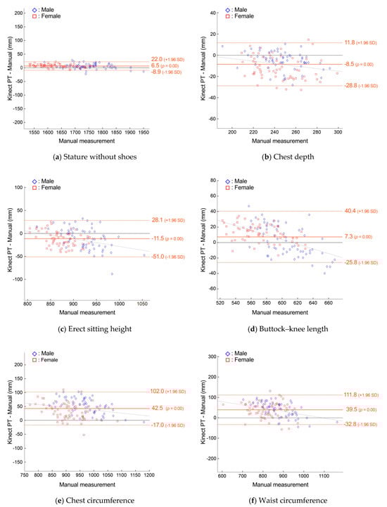 Bland−Altman plots of agreement between manual measurements and predictions from a Kinect-based system with physical training (PT) clothing for anthropometric dimensions with linear regression lines and LoA.