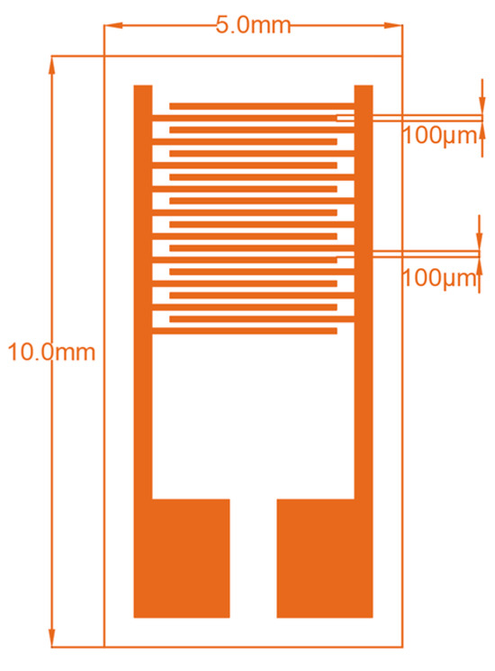Flexible PET was used as the substrate to fabricate the humidity sensor. The interdigital electrodes (IDEs) were deposited on the PET substrate. The flexible IDE substrates used in this study were commercially purchased from Huizhou Xinwenxiong Commerce & Trade Co., Ltd., Huizhou, China. The structure and dimensions of the IDE substrate are shown in Figure 1. It has 10 IDE finger pairs. The finger width is 100 μm, the finger spacing is 100 μm, and the finger length is 3.3 mm. The Cu/Ni/Au electrode thin films are 12, 4, and 1 μm thick, respectively. The IDE substrate was ultrasonically cleaned for 20 min in purified water and then dried.