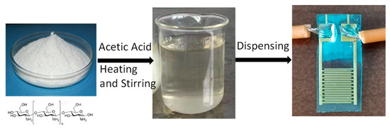 Figure 2 depicts the fabrication process of the CS-based sensors. CS powder was used to prepare the sensitive film for the humidity sensor. First, CS (1.5 g) was dissolved in acetic acid (2% vol. 100 mL) at 60 °C and stirred for 4 h until completely dissolved. A transparent, light-yellow CS solution was obtained. Then, the CS solution was sprayed onto the surface of the IDEs and left to dry at room temperature for 24 h. Finally, connection wires were soldered to the IDEs.
