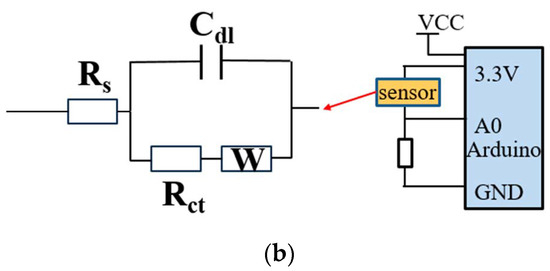The humidity testing and respiratory monitoring system comprised the development board, the Arduino program, and the humidity sensors. Figure 3a shows that the humidity sensor was connected to the internal circuit of the development board, with the sensor in the sealed bottle. The equivalent circuit is shown in Figure 3b. The CS-based sensor is represented by the left circuit model, including a double-layer capacitance (Cdl), a charge transfer impedance (Rct), a Warburg impedance (W), and a solution impedance (Rs). The Arduino circuit board converted the humidity-sensitive capacitance changes into voltage changes. The Arduino circuit board read the voltage from analog signal port A0 and transmitted it to the upper computer via a USB. Capacitance changes caused by humidity can affect variations in the partial readout voltage.