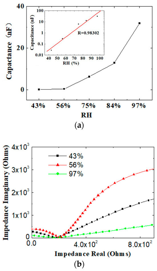 (a) Capacitance of the sensor as a function of the different humidities, inset: capacitance–RH with logarithmic vertical axis. (b) Impedance characteristics of the sensor at 43%, 56%, and 97% humidity.