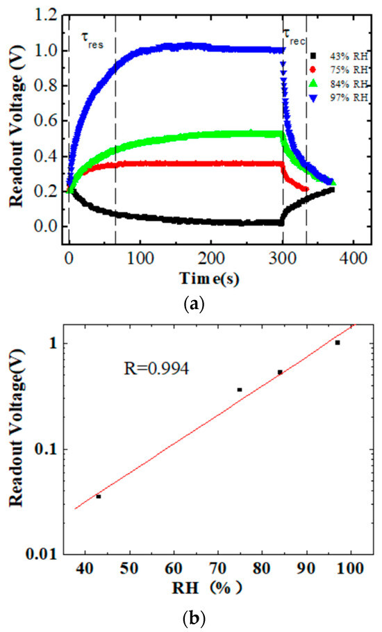 Different humidity responses were tested. The readout voltage from A0 was detected after the humidity sensor was placed from ambient air into the sealed bottles above the saturated salt solutions. As Figure 5 shows, the readout voltage increased to a steady platform of ~1.01, 0.53, and 0.36 V for 97% RH, 84% RH, and 75% RH, respectively, which represent humidities greater than ambient air humidity. However, it decreased to a steady platform of ~0.03 V for 43% RH, which represented humidity lower than ambient air humidity. According to the equivalent circuit shown in Figure 3b, at ambient air humidity, the total reactance of the sensor divided a high voltage level, and the initial voltage from A0 was about 0.2 V. As the RH increased above ambient air humidity, the total reactance decreased. As a result, the voltage drop of the sensors decreased, and the readout voltage from A0 increased. The reason for this is the opposite of that at 43% RH. The response time (τres) and recovery time (τrec) were defined as the time taken for the readout voltage to reach 90% of the total voltage change. The response time and recovery time were approximately 68 and 42 s, respectively, for the humidity range from 56% RH to 97% RH. However, the times were slower for a lower RH. This indicates that, in high humidity, water molecules are easily and rapidly adsorbed onto the surface of CS, which accelerates ion conduction and capacitance changes. In Figure 5b, the readout voltage vs. RH is plotted with a logarithmic vertical axis. It exhibited good fitting linearity with R = 0.994 in the high-humidity range. As an RH range of 43–97% is dominant during exhaled breath, a good sensing performance of the chitosan-based humidity sensor in the RH range of 43–97% is favorable for monitoring human respiration.