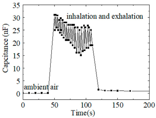 The humidity of air exhaled from the human body is close to saturation; however, the concentration of water molecules during inhalation and exhalation shifts. Thus, CS-based humidity sensors can be placed under the mouth or nose to monitor human breathing. Figure 6 shows the capacitance change in the sensors during mouth breathing. The initial capacitance was low in ambient air. The capacitance increased to ~30 nF when detecting exhaled air flow. The breathing sensitivity, S, was around 10,000%, calculated as follows [9]: