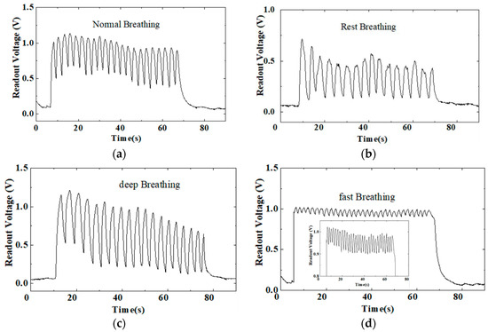 Figure 7 shows the readout voltage from A0 of different breathing modes when the sensor was placed under the subjects’ mouth. The measurement protocols were schemed as follows: the subject was in the state of normal breathing during testing, defined as “normal breathing”; deep breathing deliberately, defined as “deep breathing”; resting state with eyes closed during testing, defined as “rest breathing”; and rapid breathing deliberately, defined as “fast breathing”. The readout voltage was around 0.1–0.2 V in ambient air. During normal breathing (Figure 7a), the readout voltage instantly changed up to ~1.0 V during the exhalation moment and was reduced to ~0.5 V during inhalation. It then oscillated between 0.5 and 1.0 V. The voltage variation between inhalation and exhalation was ~0.5 V, with a variation trend in accordance with the capacitance variation shown in Figure 6. The mechanism can be explained as follows: Initially, the capacitive humidity sensor is charged at an RH of 56% in ambient air. Then, when the sensor is placed in the saturation humidity of the exhaled air, the capacitive sensor begins discharging as the sensor’s capacitance increases. Therefore, the humidity sensor voltage gradually decreases, while the readout voltage increases. The Arduino circuit with the CS sensor system converts humidity-induced sensor capacitance changes into voltage changes, which can be used to clearly visually monitor respiration status. In Figure 5a, we obtained a readout voltage platform of ~0.2 V and ~1.01 V for 56% RH and 97% RH, respectively. Here, we calculated the response time and recovery times during respiration testing for readout voltage changing from 0.2 V to 1.0 V. The response and recovery times were approximately 0.7 and 2 s, respectively. These evaluated response and recovery times meet the reference values for respiration detection. We assumed that this fast response time for the large dynamic change is favorable for distinguishing the respiration intensity and frequency of different breathing modes. Figure 7b shows that the peak voltage for exhalation was smaller, about 0.55 V, indicating the respiration intensity is lower in the rest breathing mode. A large voltage variation of ~0.75 V indicated the deep breathing mode while a small voltage variation of ~0.15 V indicated the fast breathing mode. By counting the regularly fluctuating changes in 1 min, different respiration frequencies of 16, 18, 20, and 32 breaths per minute (bmp) were obtained for rest, deep, normal, and fast breathing, respectively.