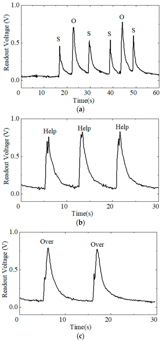 Compared with respiratory monitoring, the humidity sensors for speech recognition need faster response and recovery speeds [23]. The air exhaled from the mouth differs when speaking different characters or words. The chitosan-based humidity sensors can sensitively capture water molecules in exhaled air, which leads to changes in the humidity-related readout voltage. There is correspondence between the changing voltage waves and the speaking airflow. For example, the amplitude of the voltage indicates different characters. The peak for “S” was lower than the peak for “O” (Figure 8a) because the sensor detected a larger amount of exhaled air while pronouncing “O” than “S”. It should be stated that the sensors were put away from the mouth in the interval between “O” and “S”. Therefore, there was no peak for breathing during speaking. As our humidity sensors have a fast response rate and a large voltage change range, they can sensitively distinguish many different characters. The waveform is also unique when saying different words. For instance, “help”, as shown in Figure 8b, had a wave shape like an “M”. When speaking “help”, the waveform exhibited a peak during pronouncing/h/, a valley during pronouncing/el/, and a higher peak during pronouncing /p/. However, the wave shape was much different when speaking “over” (Figure 8c). The first peak was short and low. The second peak was wider and higher. Therefore, the various signals carried by the waves can be used to determine the corresponding characteristics of the speaking words.