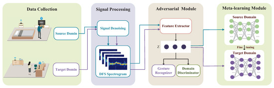 - We design a multi-domain adversarial scheme that aims to eliminate the negative impact of different domain factors on the data distribution while retaining valid information related to gestures. Furthermore, we introduce a new meta-learning framework to implement an updated model of one sample in a new domain for accurate gesture classification.