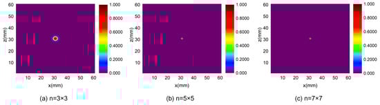 To discuss the influence of the distance between adjacent array elements on the effect of the algorithm, we have carried out three sets of numerical experiments in which the distance between adjacent array elements is set to 1 mm, 2 mm, and 3 mm, respectively. The number of array elements is , and other parameters are the same.