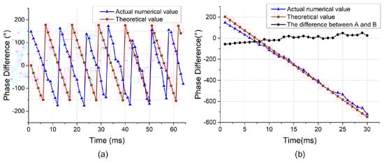 (a) The theoretical and actual values of the phase difference between the scanning sensor and the reference sensor. (b) Phase difference after unwrapping.