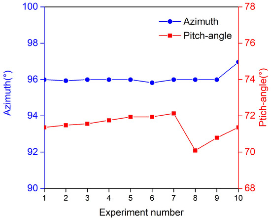 In order to evaluate the accuracy and stability of the imaging detection and localization method based on the virtual phased array, the same experiments were repeated 10 times. The location errors are defined as the difference between the estimated leakage location and the actual leakage location listed in Table 2. Localization results are plotted in Figure 8. Given the location of the actual leak hole , as can be seen from Figure 8, all the measured results are around and all the errors are around . The final measured locations of the leak hole by averaging the repeated experimental results are with standard deviations of and the averaging error is with standard deviations of . These results suggest that the virtual sensor array method can obtain a high-accuracy gas leak localization result and perform well regarding stability.