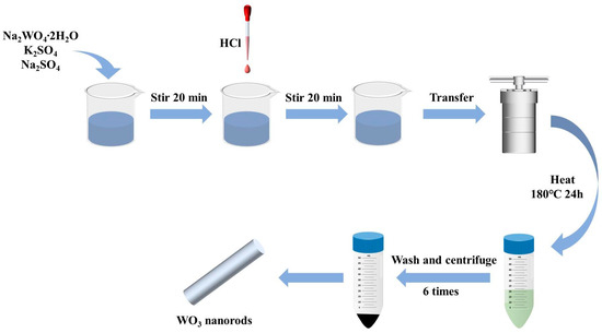 WO3 was prepared via a hydrothermal method. First, 2.05 g of Na2WO4∙2H2O, 0.25 g of Na2SO4, and 0.3 g of K2SO4 were added to 40 mL of deionized water. After stirring for 20 min, the pH was adjusted to 1.6 with 2 M HCl. The precursor solution was transferred to a 100 mL Teflon-lined autoclave and heated at 180 °C for 24 h. After cooling to 25 °C, the precipitate was centrifuged at 4000 rpm for 15 min and washed with water and anhydrous ethanol (6 times). Finally, the WO3 sample was obtained by vacuum drying at 60 °C for 8 h. The WO3 synthesis process is outlined in Figure 1. The BP-WO3 composite was synthesized using the same method, except that 1 mL of the aqueous BP solution was added after adjusting the pH.