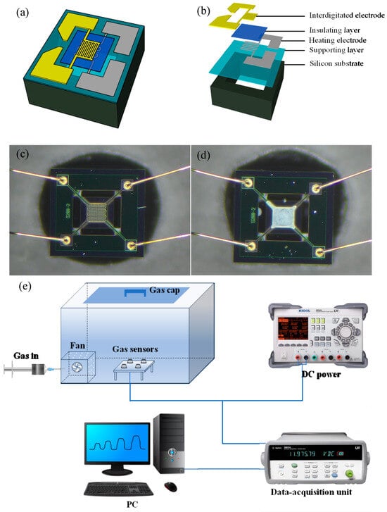 Sensors were fabricated by coating the sensing material on a MEMS substrate, consisting of an interdigitated electrode, an insulating layer, a heating electrode, a supporting layer, and a silicon substrate (Figure 2a,b). Specifically, the sensing material was ground in an agate mortar to 200 mesh and sieved. A slurry was prepared by uniformly mixing this sample with terpineol. The slurry was coated on the sensing layer of the MEMS substrate, which was then vacuum dried at 65 °C for 5 h and aged at the operating temperature for 1 week. Figure 2c,d show the physical images of the sensor. The test platform comprised a 7.5 L closed air chamber, fan, DC power supply, data-acquisition unit, and PC (Figure 2e). A syringe was used to inject a specific volume of gas into the gas chamber. The fan diffused the gas evenly and quickly into the gas chamber, and the DC power supply provided the working voltage of the sensor. Gas adsorption onto the gas-sensitive material caused a change in the sensor resistance, which was recorded by the data-acquisition unit and then uploaded to the PC.