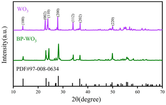 X-ray diffraction (XRD) patterns of pure WO3 and BP-WO3 at 25 °C.