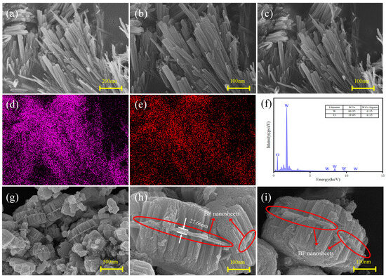 (a–c) SEM images of pure WO3; EDS elemental mapping profiles of (d) W and (e) O in pure WO3; (f) EDS spectrum of pure WO3; (g–i) SEM images of BP-WO3.