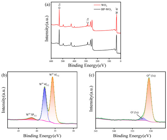 (a) XPS survey spectra of pure WO3 and BP-WO3; (b) W 4f and (c) O 1s XPS spectra of BP-WO3.