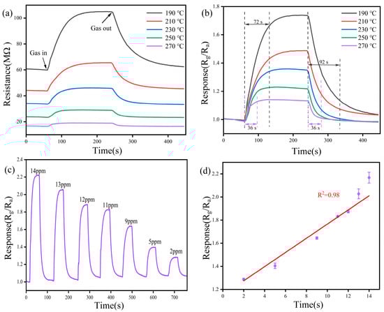 (a) Resistance and (b) response of the BP-WO3 sensor to 10 ppm NO2 at various operating temperatures; (c) response of the BP-WO3 sensor to various NO2 concentrations at 190 °C; (d) linear fitting of the BP-WO3 sensor response as a function of NO2 concentration.