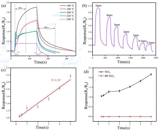(a) Response of the WO3 sensor to 4 ppm H2S at various operating temperatures; (b) response of WO3 sensor to various H2S concentrations at 160 °C; (c) linear fitting of the WO3 sensor response as a function of H2S concentration; (d) response of the WO3 and BP-WO3 sensors as a function of H2S concentration.