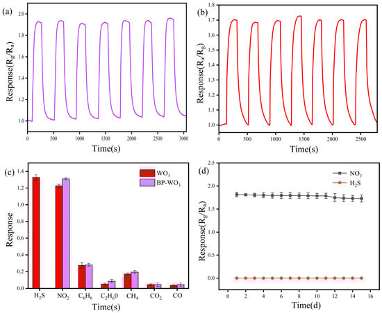 (a) Repeatability of the BP-WO3 sensor response to 12 ppm NO2; (b) repeatability of the WO3 sensor response to 3.5 ppm H2S; (c) selectivities of the BP-WO3 and WO3 sensors for various gases; (d) response of the BP-WO3 sensor to 12 ppm NO2 and 4 ppm H2S over 15 days.