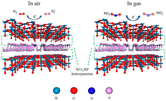 Doping with BP, a p-type semiconductor, causes most carriers to diffuse on the surfaces of BP and WO3, forming numerous p-n heterojunctions. Owing to the difference in the work functions of WO3 and BP in the air (5.15 and 3.9 eV [39,40], respectively), electrons are transferred from WO3 to the BP surface, while holes move in the opposite direction until a unified Fermi level is formed. An atomic structure model of the BP-WO3 heterojunction is shown in Figure 9. When the sensor is exposed to air, the adsorption of oxygen leads to a decrease in the electron density on the surface of WO3 and an increase in the hole density of BP, resulting in the formation of an electron depletion layer on the WO3 side and a hole accumulation layer on the BP side. As more electrons can be trapped in the material in the presence of NO2, the potential barrier of the p-n junctions increases, resulting in a decrease in the conductivity of the material. Although the sandwich-like nanostructure of BP-WO3 may contribute to its enhanced selectivity, BP-WO3 has a smaller specific surface area than the pure WO3 nanorods and thus does not provide enough adsorption sites for the interfering gases. Therefore, the stronger ability of BP-WO3 to trap electrons from NO2 is likely the main reason for the high selectivity of this material.