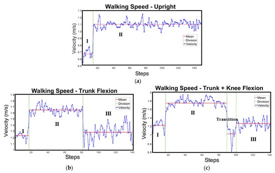 Instantaneous walking speed pattern of a participant using (a) Upright, (b) Trunk Flexion and (c) Trunk + Knee Flexion, under non-emergency and emergency scenarios (I~III represent the different stages of the walking process).