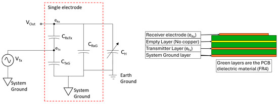 These sensors transmit a high-frequency (115 kHz) electric field from the transmitter electrode and, thus, have a high wavelength-to-electrode geometry ratio. The high ratio of the wavelength to the dimensions of the electrode results in a quasi-static field in the measurement region; therefore, there is no need to consider wave propagation and magnetic components. This allows for the measurement of the proximity of objects near the sensor’s receiver electrode so long as they are minimally conductive, like a person’s skin surface. This is because the skin surface interacts with the transmitted field and, therefore, modifies the field near the receiver electrodes. The capacitance near the receiver electrode then changes, and this is measured as the proximity to the sensor’s surface. In this way, the muscle activity under the skin’s surface can be measured owing to the volumetric expansion and contraction of the limb within a rigid sensor band, in which the electrodes are offset from the limb’s surface. The equivalent circuit and PCB construction for the sensor are shown in Figure 1. Note that in the PCB construction, the receiver electrode is smaller than the transmitter layer to ensure that the electric field is transmitted evenly over the entire surface of the receiver electrode. The empty layer is included in the construction, as commercial manufacturers only produce PCBs with a single layer or an even number of layers. This makes the empty layer necessary to produce a 3-layer board. The placement of the empty layer and the thickness of the individual layers in the PCB stack allow for the control of the key sensor design parameters, namely, the capacitances between the layers (CRxG, CTxG, and CRxTx in Figure 1), which determine the performance of the sensor. CH is the capacitance between the skin’s surface and the receiver electrode, and VTx is the 115 kHz sinusoidal signal, which generates the electric field.