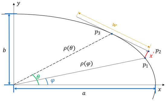 where and b are the major and minor axis lengths of the ellipse, respectively; is the centre radius of an origin-centred non-rotated ellipse at an eccentricity, α, from the x-axis; is the perpendicular distance from the edge of the sensor to the surface of the ellipse; is the permissible width of the sensor at a given ; θ is a fixed parameter defining the point on the elliptical curve to which the sensor tangentially sits; and φ is the optimisation parameter used to define the point and, hence, the width () of the sensor. This defines the value of and, therefore, determines whether the value of meets the imposed requirements. The requirement used in this application was to limit the value of to a maximum of 1 mm.
