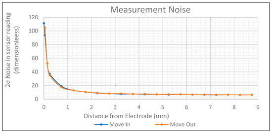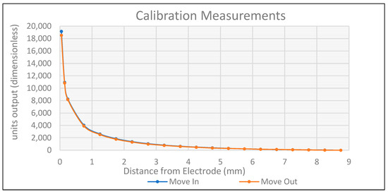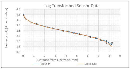 The hysteresis represents the difference between the sensor’s measurements when moving away from and towards the electrode, as shown in Figure 4. In this figure, the logarithm of the sensor’s output vs. the distance from the electrode’s surface is shown in linear coordinates to better visualise errors. The measured hysteresis fell within the bounds of the error in the signal and, therefore, is negligible.