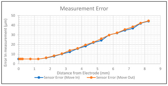 The error function for the sensor was calculated using the measurement noise at the two-sigma level and converting that to a distance, in microns, at any given displacement from the sensor electrode. With the accuracy of the micrometre being 5 microns, the smallest possible measurable error was 5 microns. The error over the full measurement range is shown in Figure 7.