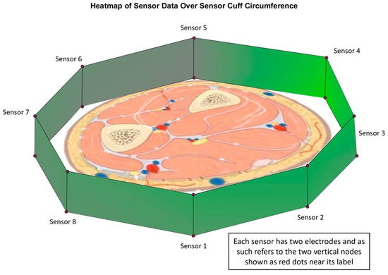 To ensure that the maximum amount of useful information was being gathered from the sensors, the configuration of the sensors around the forearm was critical. The sensors were arranged around the circumference of the forearm, equally spaced to maximise muscle and tendon coverage naively and to ensure that the coverage would be maintained with pronation or supination movements. To confirm that the sensor placement could measure the muscle activation and localisation, the data obtained at the peak muscular contraction position of a cylindrical grasp were visualised using a heatmap overlaid on the cuff’s configuration and a typical left forearm cross-section, as seen in Figure 8. A greener colour represents a greater volumetric expansion in the region, and grey represents the neutral or zero position.