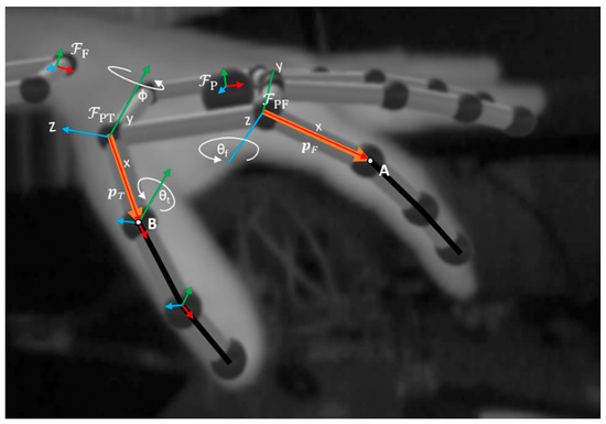 As shown in Figure 9, point B defines the metacarpal bone of the thumb, using the x-axis of . A new frame assigned at point B is then used to calculate the thumb’s F/E angle, θt, using the rotation about the y-axis from to this frame. The AB/AD degree of freedom for the thumb, ϕ, is measured using the rotation about the y-axis of from . Point A defines the proximal phalanx of the finger, using the x-axis of . is then used to calculate the finger’s F/E angle, θf, using the rotation about the z-axis from the palm frame, , to the finger frame, . The wrist movements are measured using the fixed angle rotation between the frame attached to the palm, , and the frame that is attached to the forearm, .