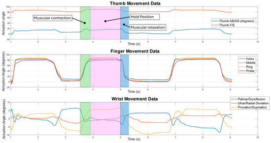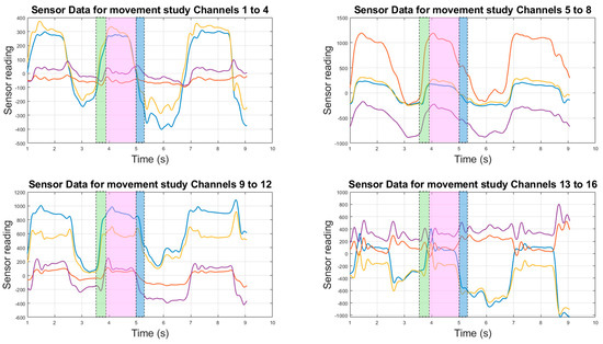 In Figure 10 and Figure 11, the key features of the movements are shown. The coloured sections are used to highlight the phases of the movements and are defined in Figure 10 for all the plots. In Figure 10, the phases of the muscular contraction, holding position, and muscular relaxation are shown. The green section represents rapid movement from an open hand position to a closed fist. The next section, in pink, shows the signals from the sensors when the fist is held closed. The final highlighted section, in blue, shows the signals from the sensors when the closed fist is opened back into the open hand position. In the green section, the sensor signals in Figure 11 mimic the finger movements in Figure 10 with some contribution from the wrist movement as relevant sensor channels rise quickly alongside joint angles. In the pink section, ringing in the sensor signals is visible and is a result of rapid movement causing some higher frequency oscillations in the muscle. A slight decline in the signals can be noticed in some channels. This represents a small volumetric contraction due to a slight muscular relaxation, as less force is required to hold that position than is required to move to another position. In the blue section, the sensor signals fall, mimicking what is happening with the joint angles. These signals from the sensors were able to capture all this detail on the movements while only measuring the muscle activity at the base of the forearm near the elbow.