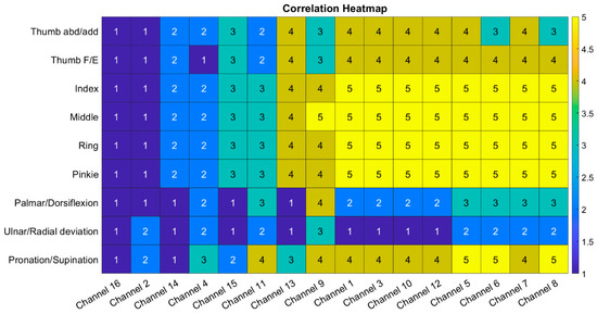 Using Ref. [39] as a guide for muscle functional purposes within the forearm, the data presented in Figure 12 will be further analysed with respect to muscle targeting. It is evident that channels 14 and 16 of the sensor array exhibit a low correlation with all the movements. However, this is expected, as they target the extensor carpi ulnaris muscle, which controls the ulnar deviation. This muscle was not significantly used in the movements that were studied. The rotation of the forearm, caused by pronation or supination, can bring channel 14 nearer to the flexor digitorum profundus muscle, and this is why it demonstrates a marginally higher correlation than channel 16 for finger motions.