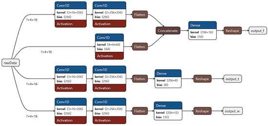 A multi-task CNN was chosen as the model structure owing to its high performance in the required task, as determined after experimenting with different architectures until one was able to achieve a satisfactory performance. This type of neural network is often used for solving classification problems [40]; however, it is also well suited to regression problems. The structure of the proposed model is shown in Figure 14, where GELU was used as the activation function for all the layers of the model for which an activation function was applied, the mean-square error was used as a loss function for training, and the stride size was set to one for all the temporal convolutional layers. Reshaping was applied after the dense output layers to ensure that the output of the model was correctly formatted as sequences. The model’s weights were split among three individual tasks: finger, wrist, and thumb regressions, as the three tasks were sufficiently distinct from each other and performed better when tailoring the weights to their individual task as compared to using a shared set of weights. The question marks in the figure indicate that the dimension is unknown until runtime, as they indicate the batch dimension; the inputs are formatted as matrices with dimensions in the order batch, timesteps, and channel. The model’s hyperparameters are summarised in Table 3.